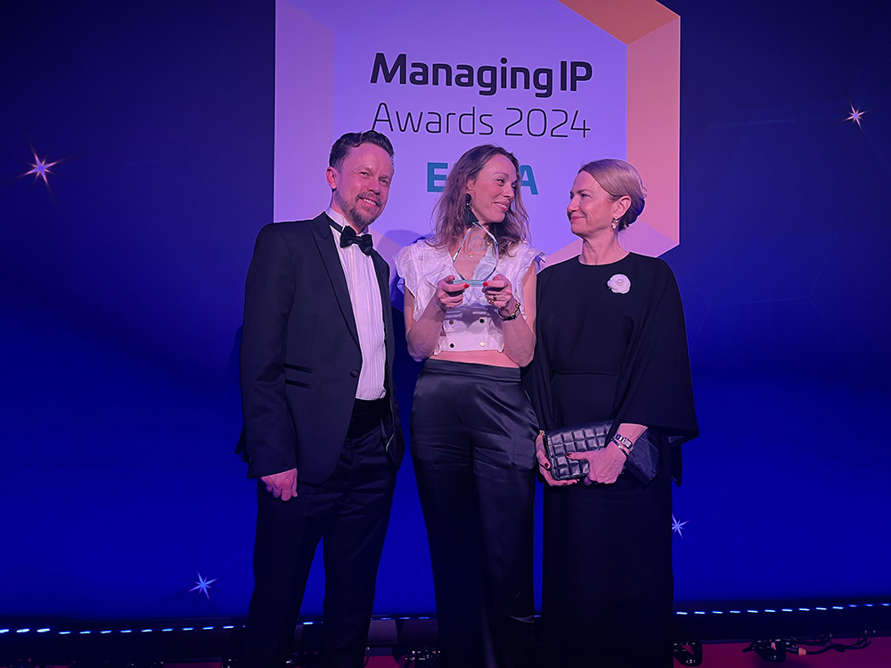 A big thank you to the Global IP Awards for this recognition and to my colleagues for their incredible support and dedication, says Karin Crafoord, Managing Partner, Head of Legal and Trademark Department.